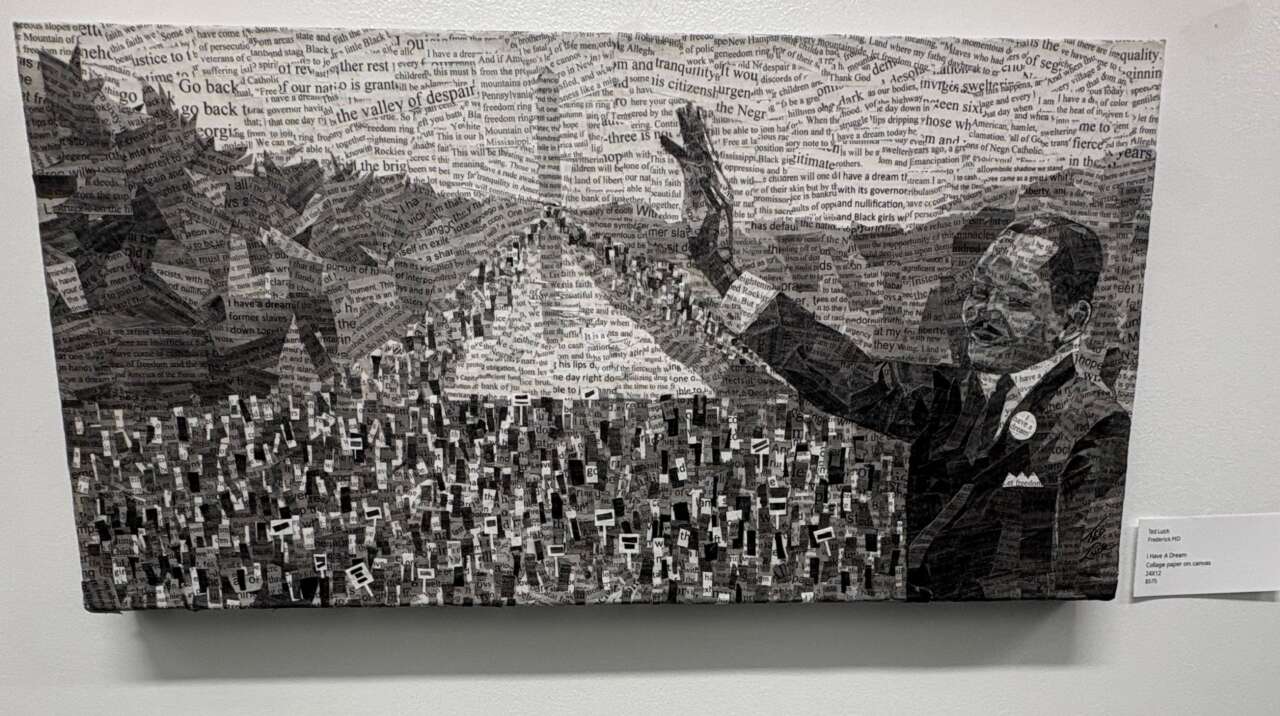 Featured in Shades of Black, Ted Luck brought his mixed-media work to the exhibition with a compelling piece titled I Have a Dream, a collage on canvas that bridges personal reflection and social commentary. A long-time member of the Frederick creative community, Luck has transitioned from a distinguished career in education to full-time artistic practice, becoming known for work that blends technicality with emotional depth. His pieces often speak to resilience and collective experience, which made his presence at Shades of Black a highlight for many visitors who admired both his technique and message.